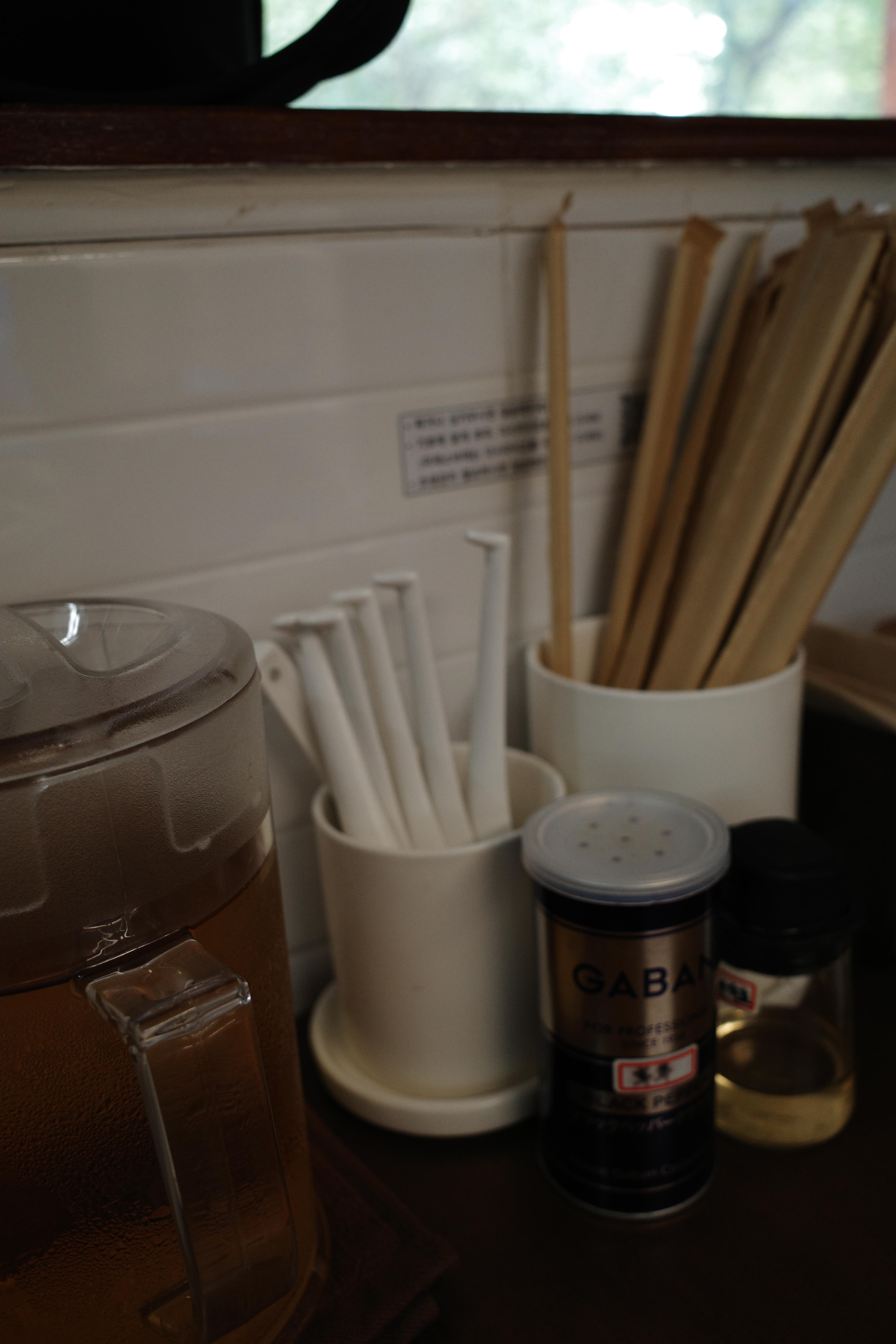 다시마 식초와 후추, 냅킨, 컵, 물이 각각 준비되어 있습니다.
