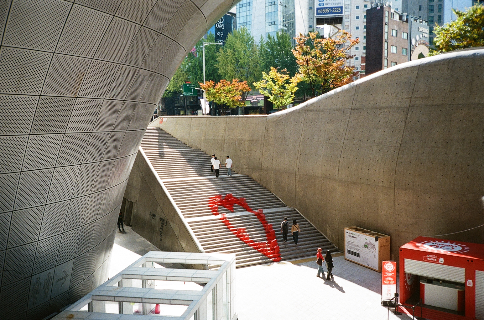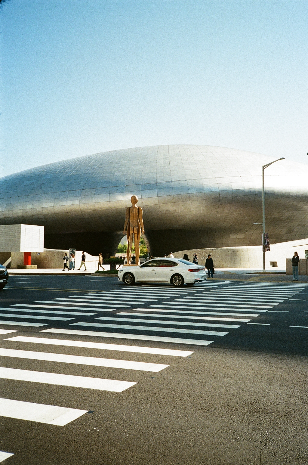 조각상과 DDP 동굴 같은 부분 뒤로 풍경이 보이는 장면이 예뻐서 촬영했습니다.